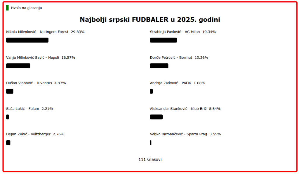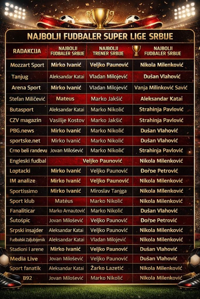 Za najboljeg trenera Srbije ste izabrali Veljka Paunovića. Najbolji fudbaler Super lige Srbije je Aleksandar Katai dok ste za najboljeg fudbalera Srbije izabrali Nikolu Milenkovića.