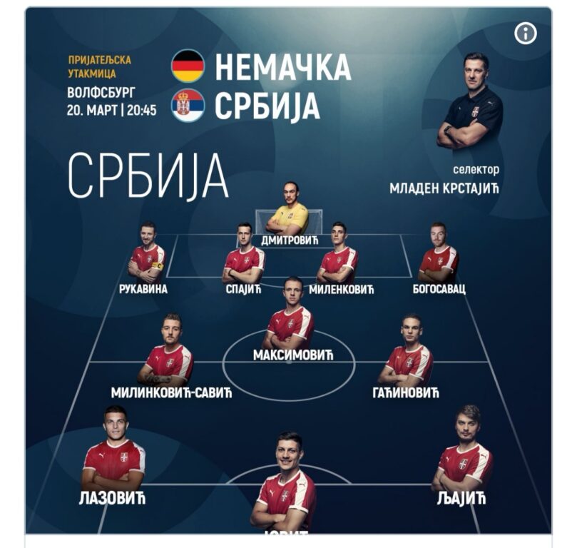 Nemačka Srbija 1-1 , da li ovaj tim ima perspektivu?Grbić Marko21. mart 2019.Fudbalska reprezentacija Srbije, Reprezentacija Prijateljski meč između Nemačke i Srbije možemo okarakterisati kao pozitivan. Za detaljniju analizu pogledajte video. Oznake# Nemačka# Prijateljski meč# Reprezentacija# Srbija Povezane vesti Paunović iznenadio Srbija u Grupi 2 Dejan Stanković na klupi Crvene zvezde